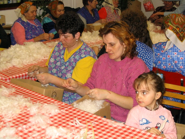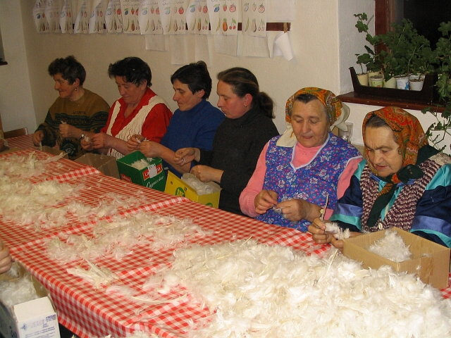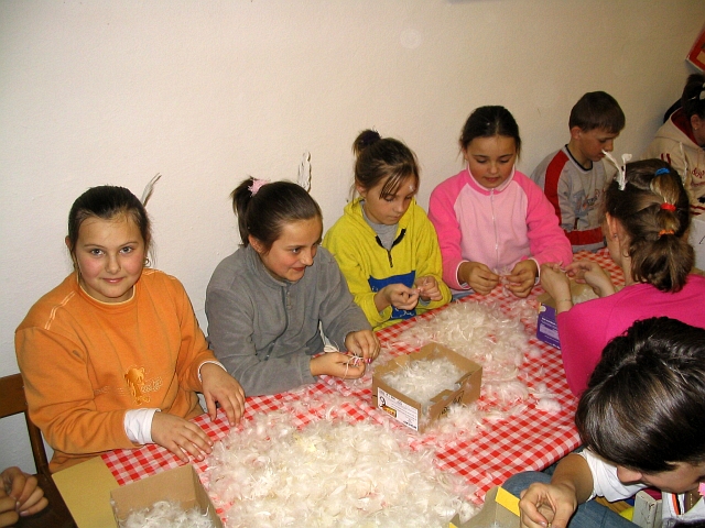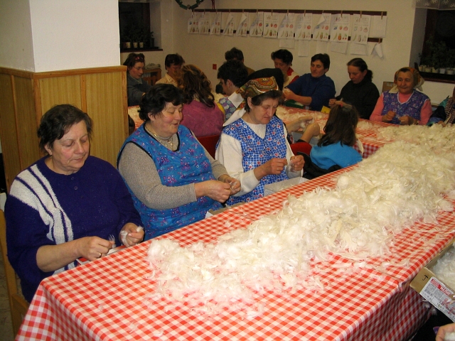 | Dievčatá aj tento rok prišli do školskej jedálne na tradičné páračky | Nechýbali ani chlapci, ktorí sa veru tiež nedali zahanbiť | Peria bolo síce dosť, ale práca išla "od ruky" |