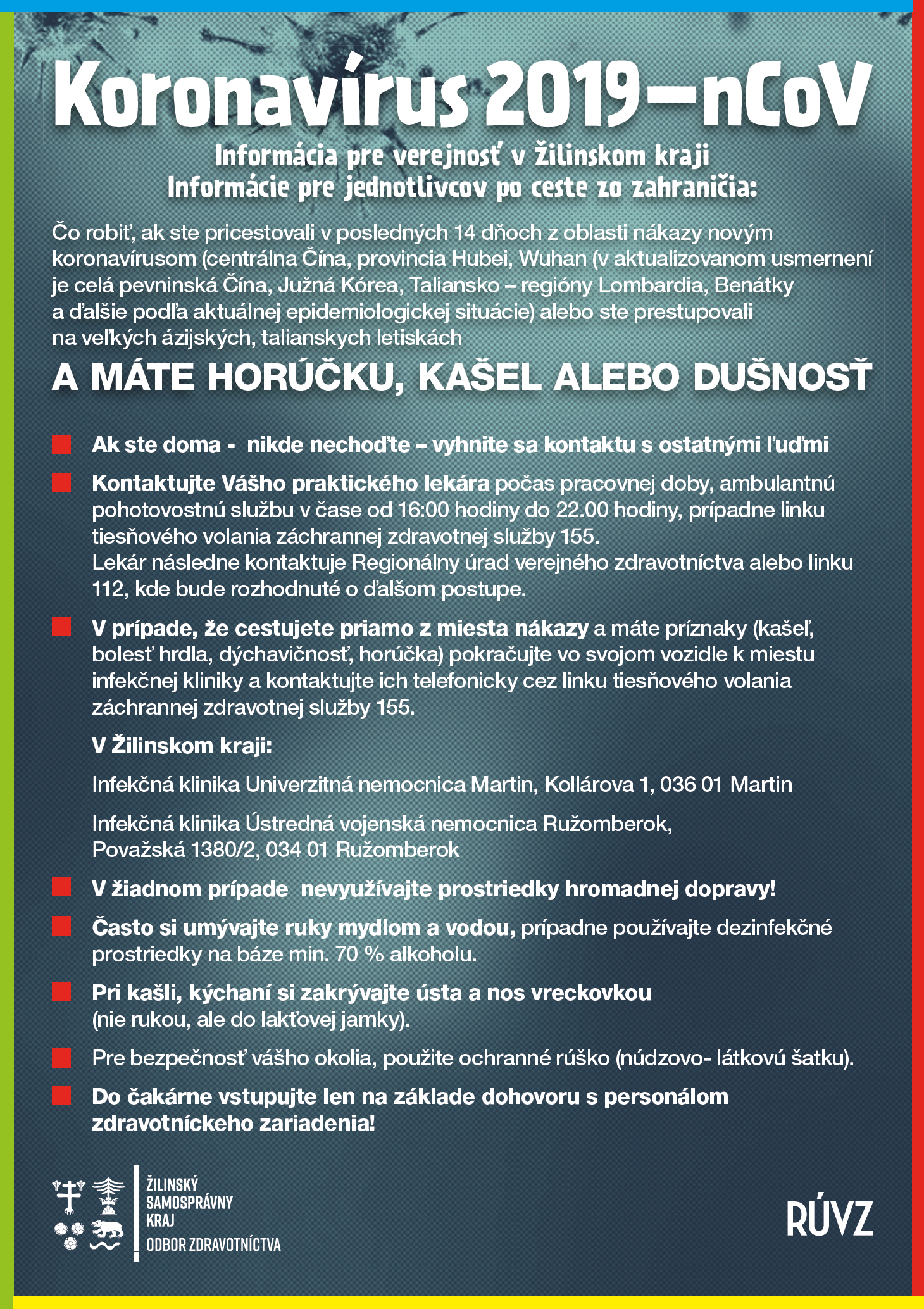 Vzhľadom na mimoriadnu situáciu a protiepidemiologické opatrenia prevencie koronavírusu COVIT – 2019, boli vydané informácie pre verejnosť v Žilinskom kraji.