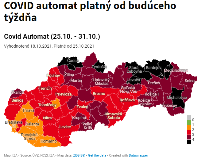 Najprísnejšie opatrenia budú od 25. októbra platiť už v desiatich okresoch. V druhom stupni ohrozenia, teda v bordovej fáze, bude 30 okresov. Červených okresov bude 27, oranžových 12.