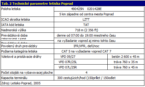 Vďaka svojej geografickej polohe má letisko Poprad - Tatry mimoriadne dobré poveternostné podmienky, často leží nad hranicou hmly a využívajú ho ako náhradné letisko lietadlá pôvodne smerujúce do Košíc, Sliača, Žiliny, či dokonca Bratislavy. Základné technické a kapacitné ukazovatele prezentuje nasledujúca tabuľka.