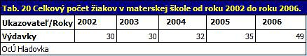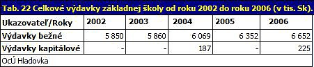 Čo sa týka ostatného materiálneho vybavenia, postupne zastaráva a stáva sa nevyhovujúcim z hľadiska jeho ďalšieho využitia na pedagogické účely. V priebehu budúcich rokov obec plánuje postupnú obnovu a doplnenie materiálneho vybavenia, aby škola spĺňala bežné štandardy základných škôl. Celkové výdavky od roku 2002 do roku 2006 prezentuje nasledujúca tabuľka.
