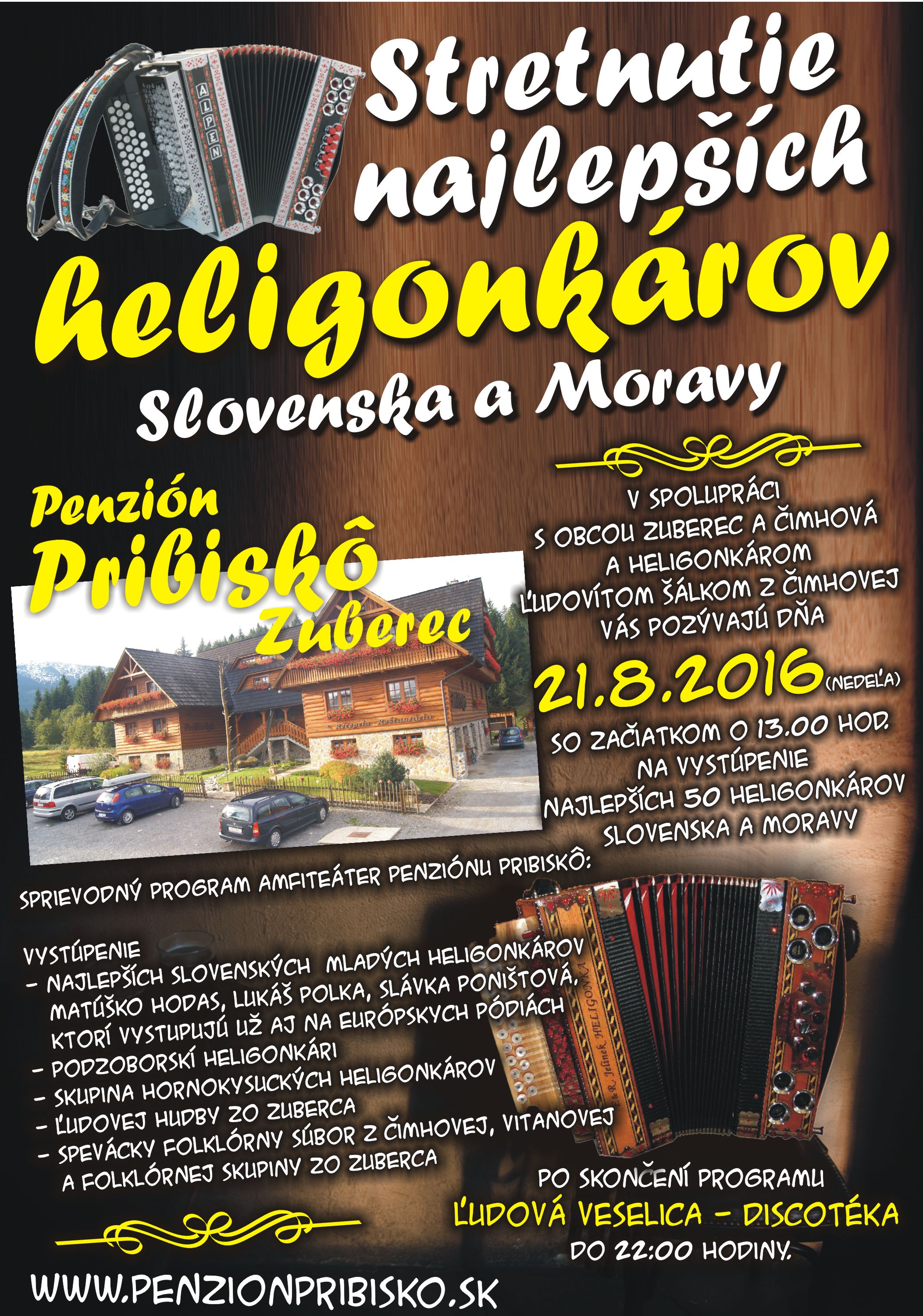 Penzión Pribiskô v Zuberci v spolupráci s obcami Zuberec, Čimhová a heligonkárom Ľudovítom Šálkom z Čimhovej Vás pozývajú na Stretnutie najlepších heligonkárov Slovenska a Moravy, ktoré sa uskutoční v nedeľu 21. 8. 2016. Viac podrobnosti v prílohe.