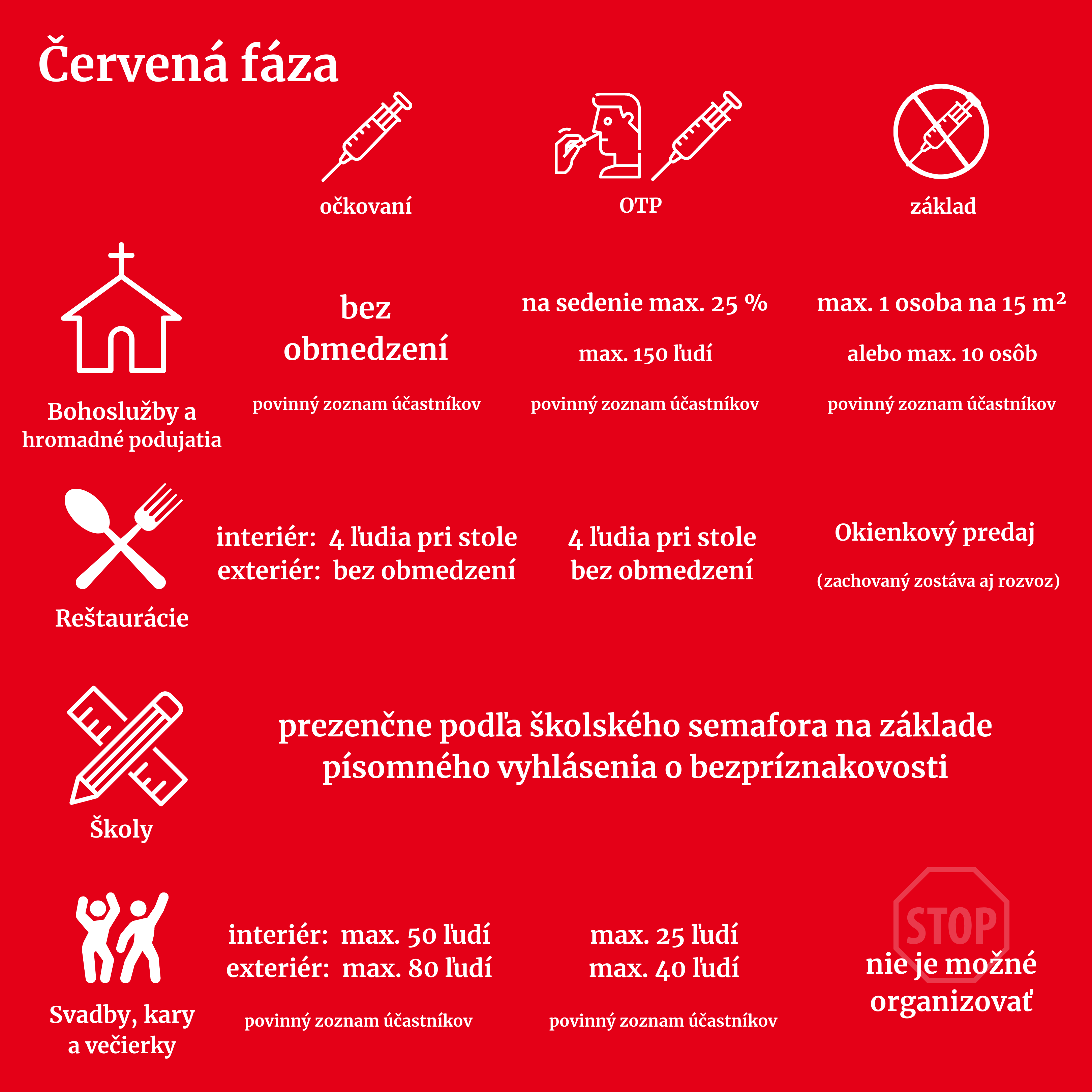 červená fáza – prvý stupeň ohrozenia: okresy Bánovce nad Bebravou, Banská Štiavnica, Brezno, Bytča, Gelnica, Košice I - IV, Košice-okolie, Levice, Levoča, Martin, Poprad, Prešov, Revúca, Sabinov, Senica, Snina, Spišská Nová Ves, Stará Ľubovňa, Svidník, Trenčín, Veľký Krtíš, Žarnovica, Žilina a Zvolen