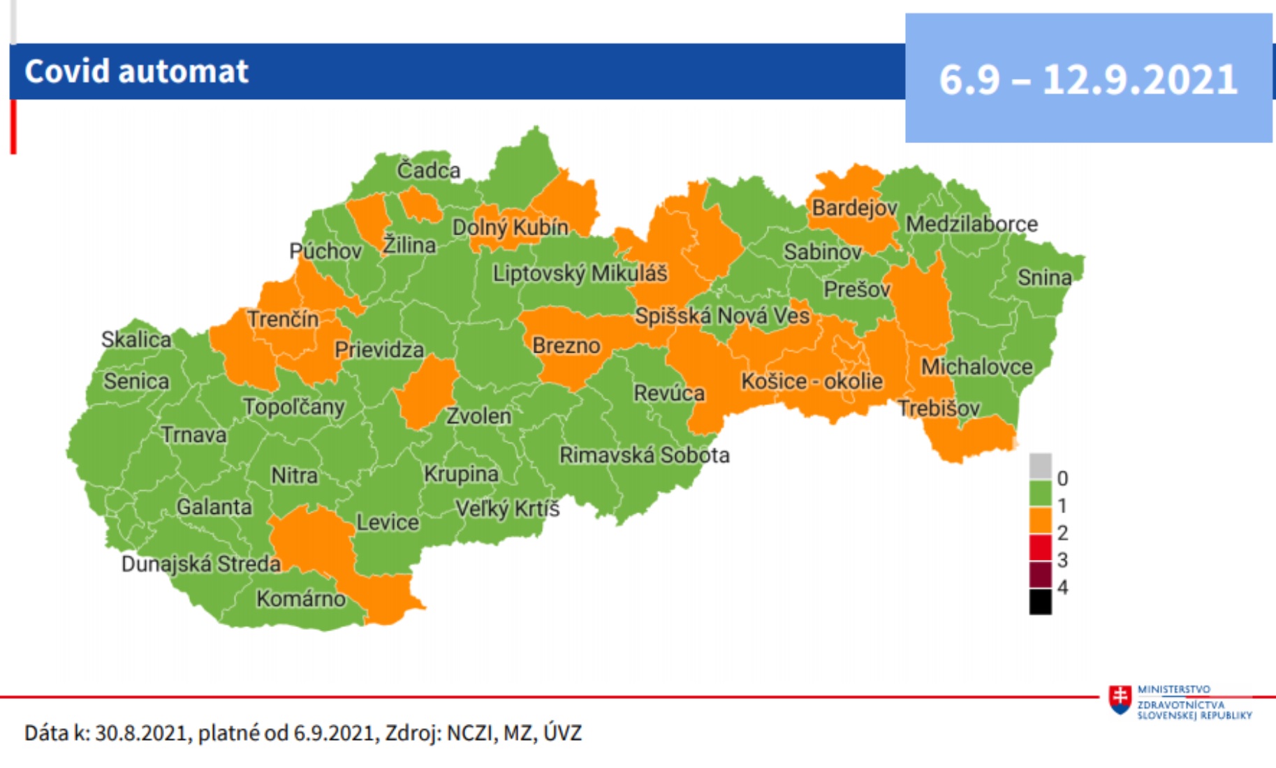 Od pondelka 6. septembra bude podľa covid automatu v stupni ostražitosti 23 okresov.