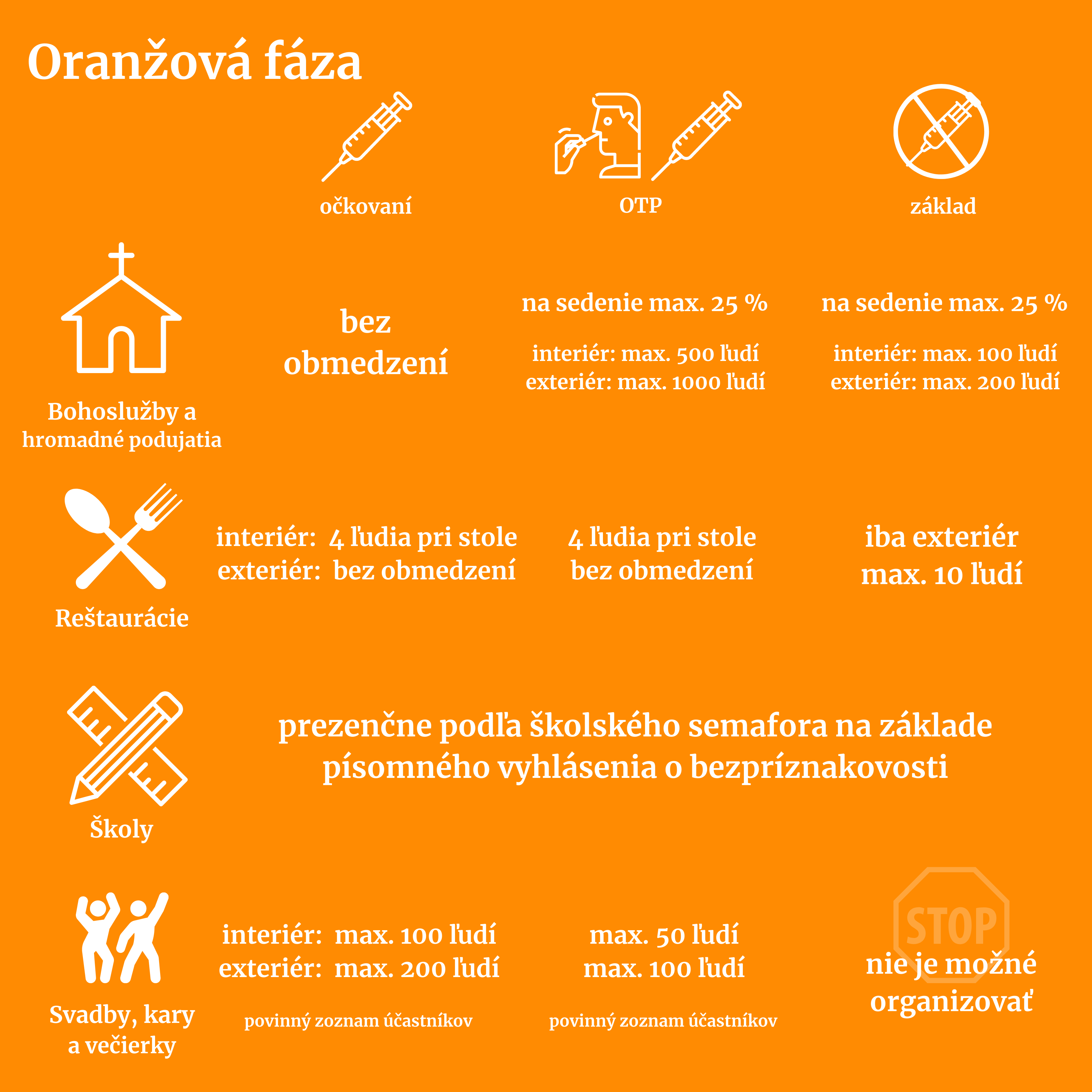 V oranžových okresoch platia prísnejšie podmienky napríklad pre hromadné podujatia, reštaurácie, fitnescentrá či wellness, ale aj svadby a kary. Počet ľudí sa bude odvíjať od režimu, ktorý si vyberie organizátor.