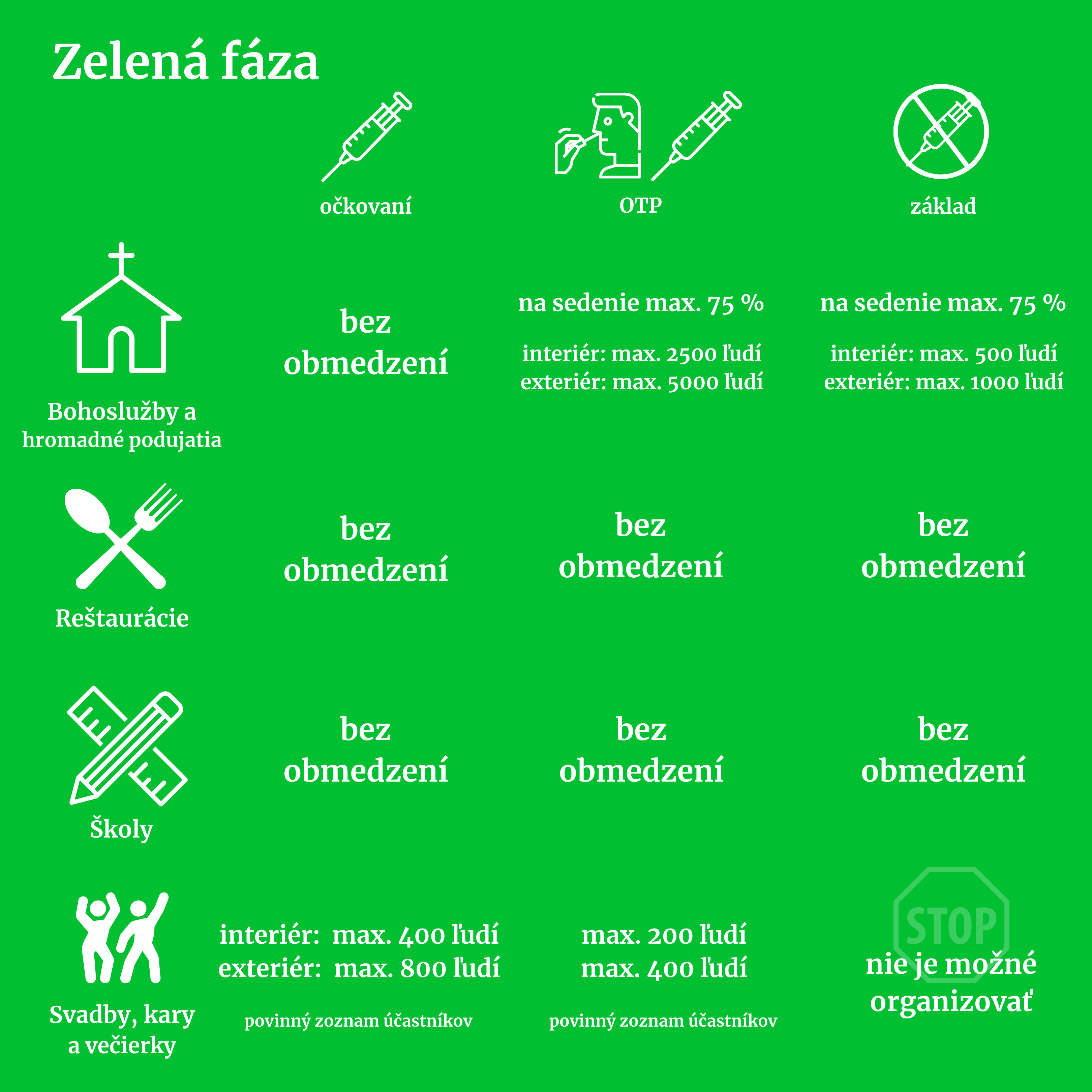 V zelených okresoch môžu kompletne zaočkovaní väčšinu aktivít vykonávať bez obmedzenia, s miernymi obmedzeniami musia rátať neočkovaní či netestovaní na ochorenie covid-19. Nosenie rúšok zostáva povinné v interiéroch v zelených aj oranžových okresoch.