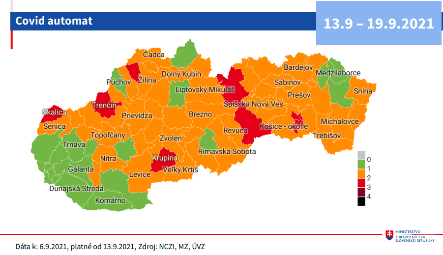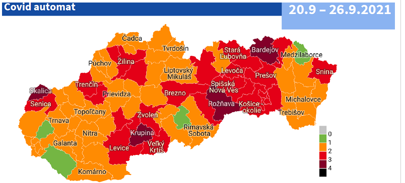 Od 27. septembra bude podľa Covid automatu na Slovensku zelený - v stupni monitoringu už len okres Dunajská Streda. Oranžových – v stupni ostražitosti bude 34 okresov a do červenej fázy – prvého stupňa ohrozenia sa dostane 39 okresov. V bordovej fáze – druhom stupni ohrozenia bude päť okresov.