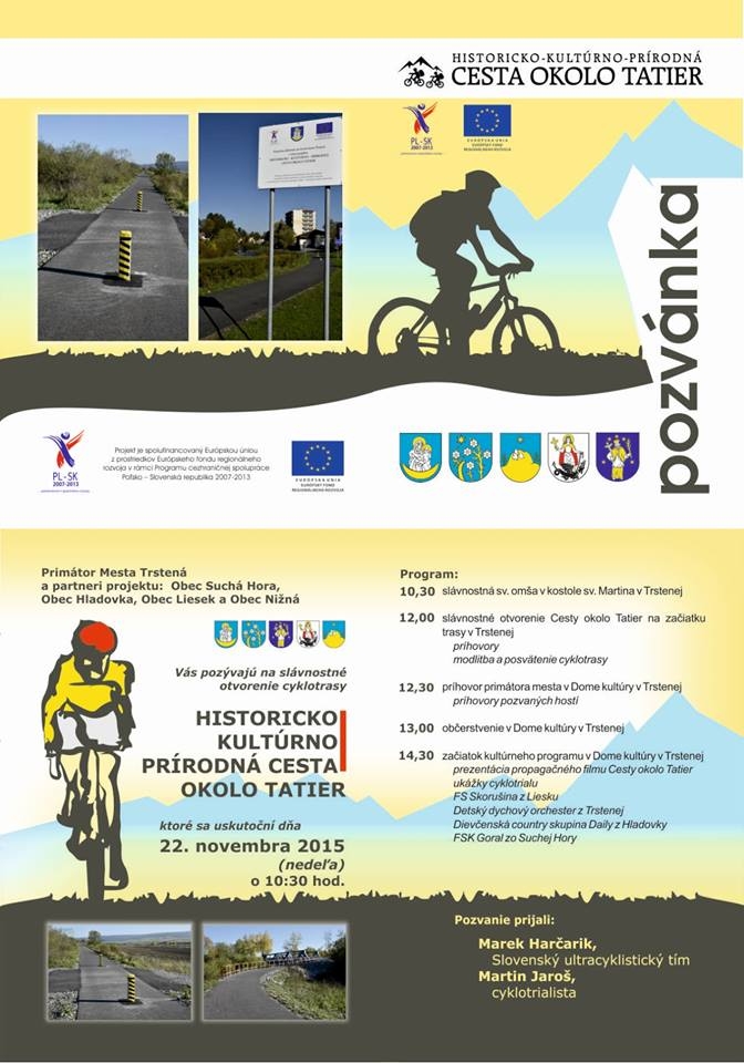Obec Hladovka a partneri projektu Mesto Trstená, Obec Suchá Hora, Obec Liesek a Obec Nižná Vás pozývajú na slávnostné otvorenie cyklotrasy Historicko-kultúrno-prírodná cesta okolo Tatier, ktoré sa uskutoční v nedeľu dňa 22.11.2015. Všetci ste srdečne vítaní. Viac podrobnosti nájdete v priloženej pozvánke.