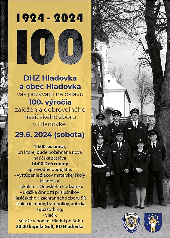 DHZ Hladovka a vedenie obce Hladovka Vás všetkých, v sobotu, 29. 6. 2024, pozýva na oslavu 100. výročia založenia Dobrovoľného hasičského zboru v Hladovke a zároveň s tým spojený Deň rodiny. Viac informácií na plagáte.