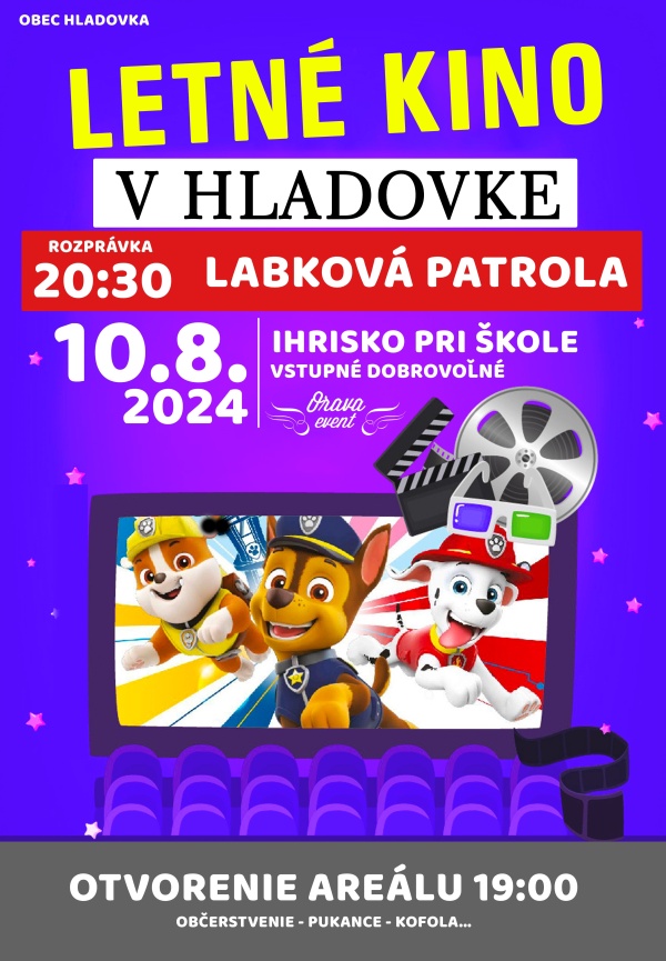 Obec Hladovka, v spolupráci s AKTIVITA o.z. vás srdečne pozývajú v sobotu 10. 8. 2024 o 20:00 hod. na letné kino. Premietať sa bude animovaná rozprávka “Labková patrola”. Môžete tešiť aj na vynikajúce občerstvenie počas premietania. Brány areálu a bufety s občerstvením sa otvoria už o 19:00 hod.